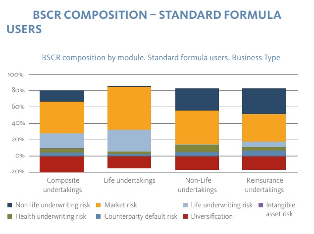 El texto también indica que el riesgo de mercado es el más importante y representa entre el 25% y el 80% del BSCR para todos los países utilizando la fórmula estándar. Para la mayoría de estos estados -26 de 31- el capital no restringido (unrestricted capital) supone el 90%.