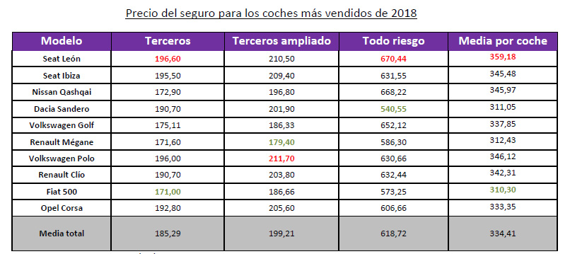 El Seat León es el coche más vendido en lo que va de año (con 24.321 unidades comercializadas entre enero y julio) pero, además, es el más caro de asegurar entre los vehículos que lideran los datos de matriculaciones. Según datos de Kelisto, la prima que un conductor tendría que desembolsar por proteger este modelo asciende a 359,18 euros de media. Además de tener el precio medio del seguro de Coche más elevado, también es el más caro de asegurar a terceros (196,60 euros) o a todo riesgo (670,44). En cuanto a los vehículos más baratos de asegurar, el Fiat 500 tiene la póliza a terceros más barata (171 euros). El Renault Mégane es el coche más barato de asegurar con un terceros ampliado (179,40 euros), mientras que el Dacia Sandero tiene el seguro a todo riesgo más barato (540,55 euros).