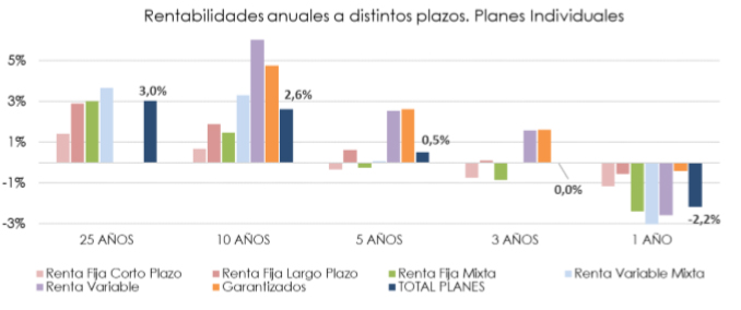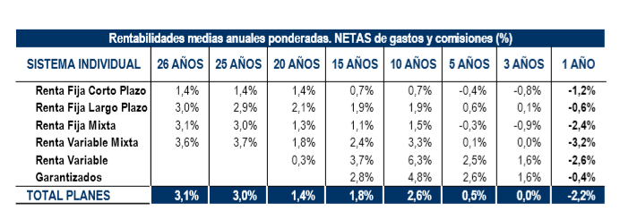 No obstante, los datos reflejan una caída interanual del 2,2% con todos los planes en negativo. El que aguanta peor el tipo son los de Renta Variable Mixta con un retroceso del 3,2%, seguido de los de Renta Variable con el