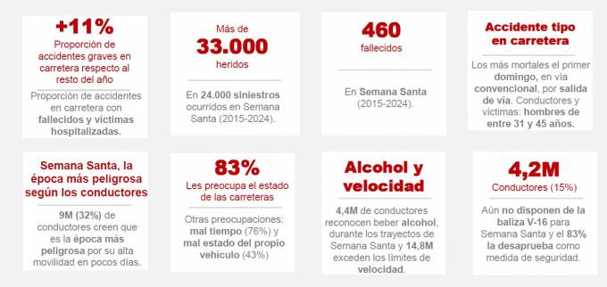 Entre las principales conclusiones, el estudio señala que la proporción de accidentes en carretera con fallecidos y hospitalizados aumenta un 11% en Semana Santa poniendo el foco el domingo de Ramos como el día más peligroso.
