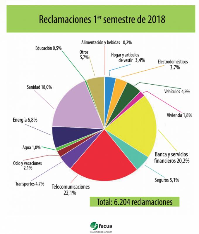 Hasta junio la organización de consumidores recibió un total de 6.204 reclamaciones y 23.722 consultas. En cuanto a las consultas el seguro acaparó el 5%, muy lejos de sectores como en sanitario con algo más del 23% debido a las incidencias de las clínicas iDental, las telecomunicaciones (16%) o la banca (15%).