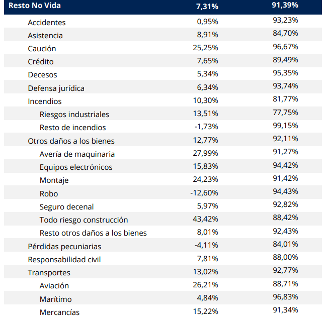 La parte de Resto No Vida, los negocios más ligados a la economía, mejoran sus primas un 7,3% y superan los 10.500 millones. Aquí encontramos avances notables como Caución (+25,2%), Transportes (+13%) u Otros daños a los Bienes (+12,8%).