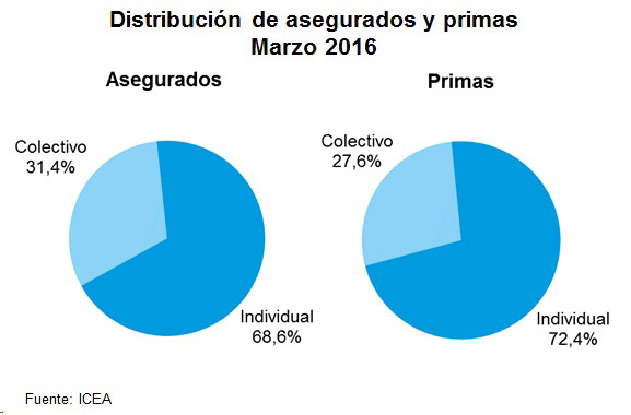 Según los últimos datos de ICEA, los seguros individuales supusieron un 72,4% de la recaudación y un 68,6% de los asegurados a marzo de 2016. En cuanto al crecimiento, los seguros colectivos crecieron un 5,6% en primas frente a un crecimiento del 2,3% de los seguros individuales.
