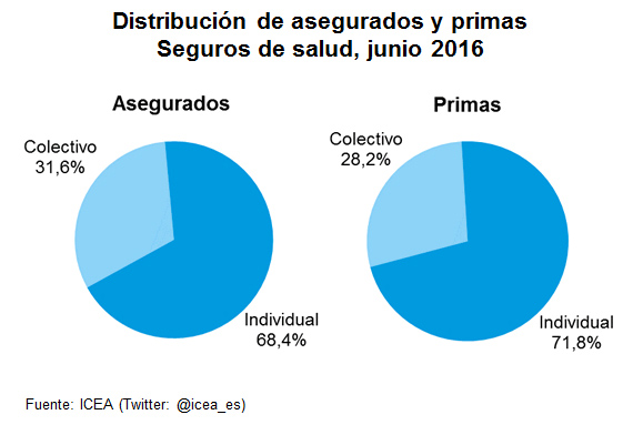 El crecimiento en primas de los seguros colectivos de Salud a junio de 2016 fue más del triple que el de los individuales. Según los datos de ICEA, los seguros colectivos crecieron un 8,5% en primas frente a un crecimiento del 2,7% de los seguros individuales. Estos últimos supusieron un 71,8% de la recaudación y un 68,4% de los asegurados.