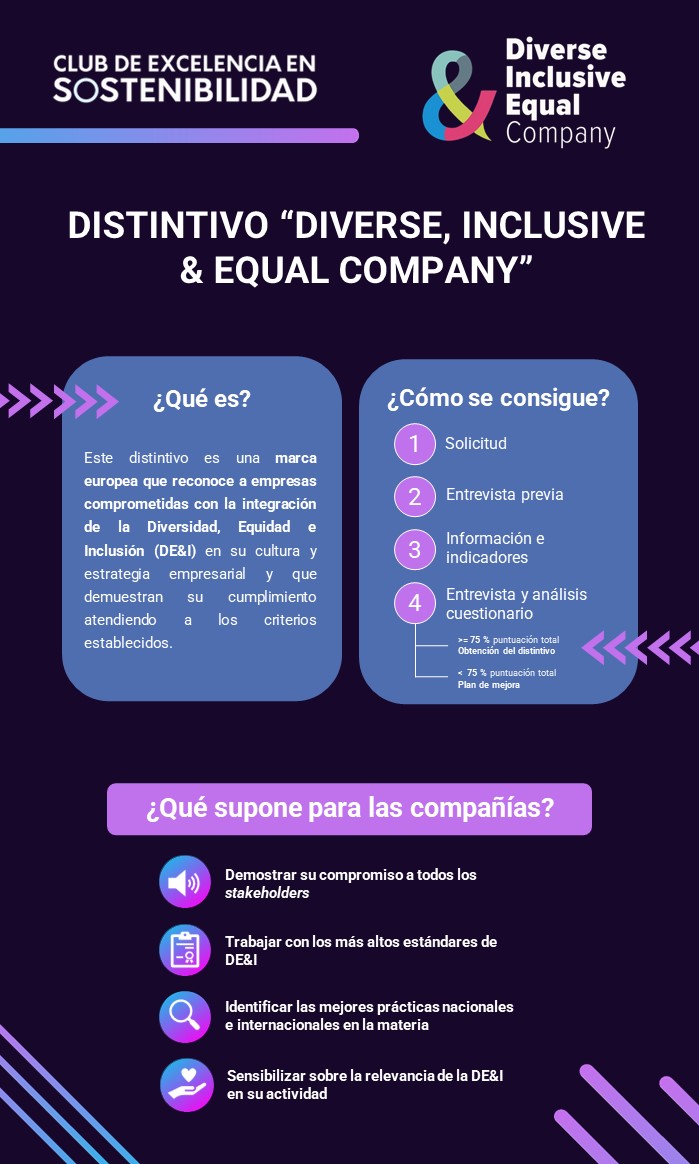 Las empresas que así lo requieran contarán con un nuevo distintivo que resaltará su apuesta por la diversidad. El Club de Excelencia en Sostenibilidad con el fin de reconocer la buena práctica de los criterios DE&I (Diverse, Inclusive & Equal