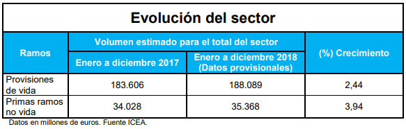 El sector asegurador ha cerrado 2018 con un volumen de primas de 64.232 millones de euros, lo que supone un incremento del 1,34% respecto al pasado año. El negocio de No Vida ha potenciado este crecimiento con un avance del 3,9% hasta totalizar primas por valor de 35.368 millones, mientras que Vida consiguió 28.914 millones en primas y una caída del 1,7%. El ahorro gestionado de este último negocio alcanza los 188.000 millones, con una mejora respecto a los datos de 2017 de 2,44%.