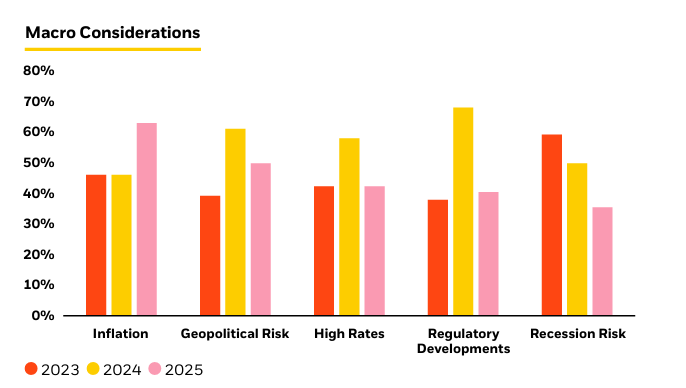 En este contexto, la inflación vuelve a figurar como uno de los principales riesgos macroeconómicos. Este riesgo resurge como el principal desafío y es citado por el 63% de las aseguradoras encuestadas. Los 5 riesgos principales se mantienen constantes respecto a los 2 años anteriores, aunque cambia su orden -inflación, geopolítica, altas tasas, regulación, riesgo de recesión-.