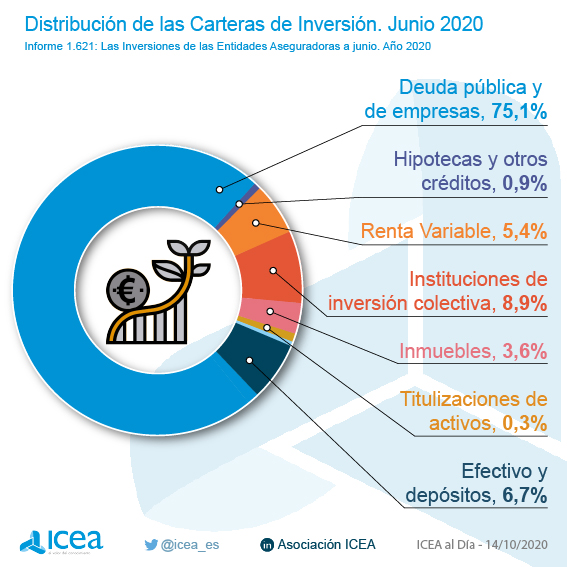 La deuda pública y de empresas acapara el 75,1% de la cartera de inversiones del seguro español, según datos de ICEA recogidos hasta junio de 2020. Si bien, el porcentaje varía según la actividad principal de las aseguradoras. En el caso de las compañías especializadas en Vida, la inversión en deuda se eleva hasta el 79,56%, mientras que en el supuesto de las entidades de No Vida cae hasta el 38,79%.