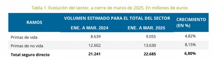 El seguro español ha alcanzado un volumen de primas al cierre del primer trimestre de 22.685 millones, un 6,8% superiores a lo registrado hace un año. Según los datos que acaba de hacer públicos Unespa e ICEA, el ramo de No Vida lidera el avance gracias a incrementar sus primas un 8,1% y totalizar 13.630 millones, mientras que Vida logra 9.055 millones y un crecimiento del