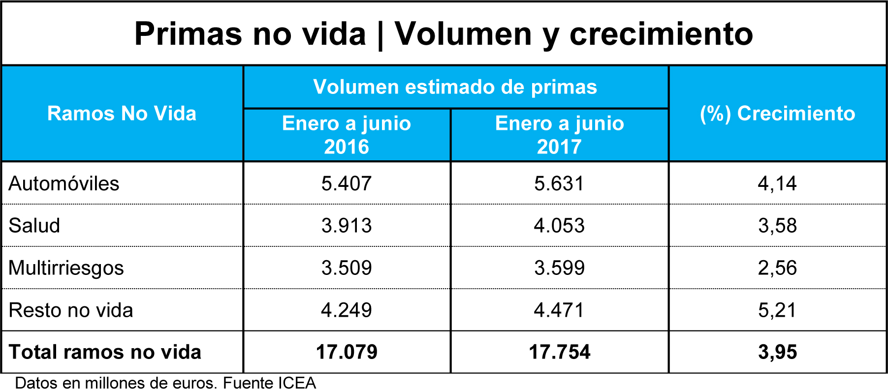 La facturación del ramo de No Vida aumentaba a cierre del segundo trimestre un 3,95% en términos interanuales. La mejora de esta actividad se fundamenta en el tirón de todas las líneas de negocio, con mención especial de las pólizas denominadas 'Resto No Vida' y Automóviles. La partida de seguros denominada Resto No vida', que engloba las pólizas más ligadas a la actividad económica, repuntó un 5,21%, hasta los 4.471 millones. Mientras, las pólizas de Motor incrementaron su aportación un 4,14%, hasta los 5.631 millones.