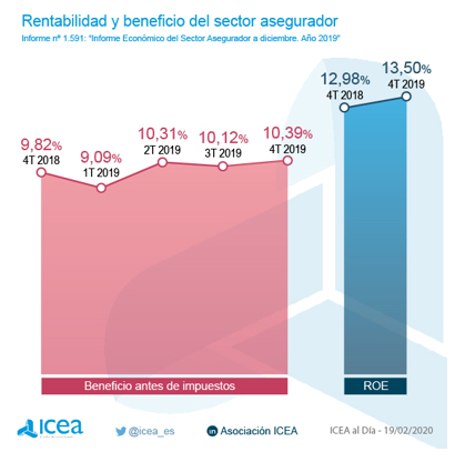 El beneficio antes de impuestos del sector asegurador en 2019 ascendió 6.655,7 millones, el 10,39% sobre el total de primas, según datos de ICEA. El sector registró un notable incremento de la rentabilidad en el cuarto trimestre respecto al año anterior con una mejora de 0,57 puntos porcentuales.