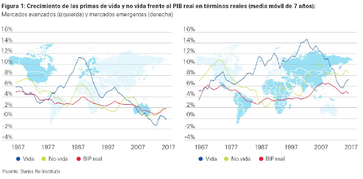 Como en los ejercicios anteriores, los mercados emergentes siguen tirando del seguro mundial. En 2017, su volumen de primas ha crecido un 10,3% en términos reales (14% en Vida y 6,1% en No Vida). Y China continúa siendo su principal motor de crecimiento a pesar de que su economía se está ralentizando. El mercado chino de Vida ha crecido un 21% en 2017, muy por encima de su promedio de la última década (14%), convirtiéndolo en el segundo mercado más grande del mundo por detrás de EEUU. Ya representa más de la mitad de las primas de Vida suscritas en los mercados emergentes, lo que supone el 11% del total mundial.