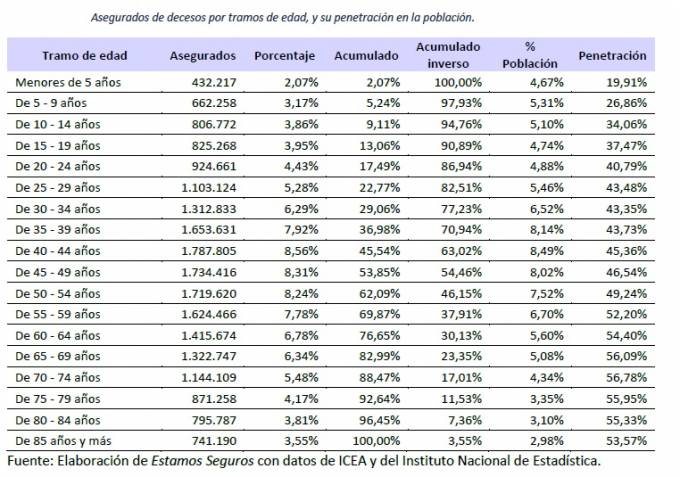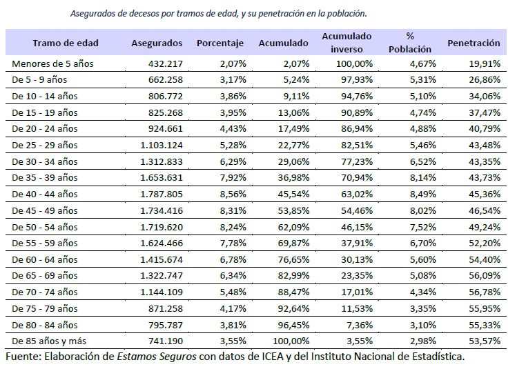 Los índices de suscripción más altos de este producto se dan pasados los 45 años y, muy especialmente, en la vejez. No obstante, el seguro de Decesos también está bastante presente entre los niños y la gente joven. Las tasas de aseguramiento entre las cohortes de población menores de 30 años oscilan entre el 27% y el 44%.