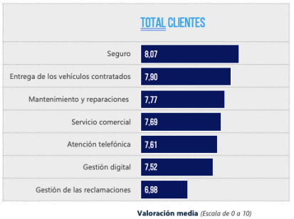 En cuanto a los servicios opcionales, el mejor valorado por los clientes en general es la entrega y recogida de vehículos (7,97), la gestión telemática (7,78) y la tarjeta de combustible (7,66).
