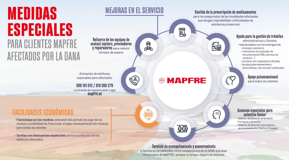 los afectados puedan "recuperar lo antes posible la normalidad". Entre ellos, se alude a la tramitación de duplicados de documentación, contacto con organismos oficiales e información sobre ayudas económicas y consejos sanitarios. Mapfre también ofrecerá la gestión de la prescripción de medicamentos para los asegurados de las localidades afectadas por medio del Centro Médico Mapfre de Valencia (valencia@centromedicomapfre.com).