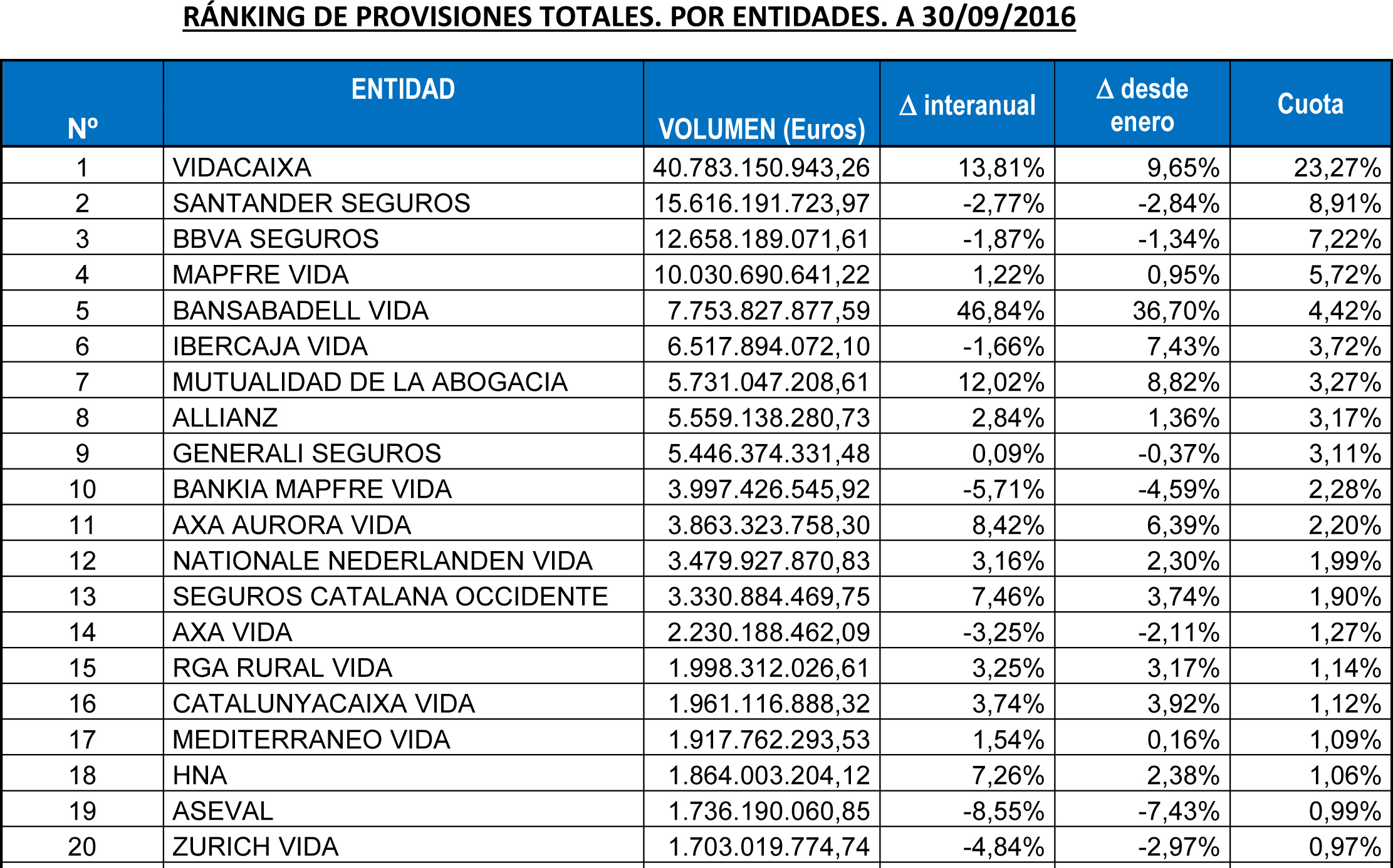 Además de CaixaBank y Bansabadell Vida, también de más de dos dígitos ha sido el crecimiento en provisiones de Mutualidad de la Abogacía, un 12,02% hasta los 5.731 millones de euros. Esta entidad ha subido 2 puestos en el ranking, hasta el 7º, con una cuota de mercado del 3,27%, un 3,11% en septiembre de 2015.