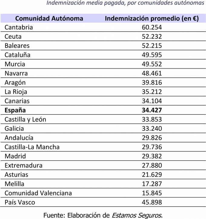 La distribución geográfica del importe promedio de las indemnizaciones es distinta. Los territorios donde los pagos medios por caso son más elevados son Cantabria (60.254 euros), Ceuta (52.232 euros), Baleares (52.215 euros) y Cataluña (49.595 euros). Los lugares donde las prestaciones fueron menores fueron, entre tanto, la Comunidad Valenciana (15.845 euros), Melilla (17.287 euros) y Asturias (21.629 euros).