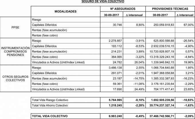 El seguro de Vida colectivo mantiene su tendencia negativa, con un recorte de las provisiones técnicas del 2,09%, hasta los 37.466 millones. Pero en este caso lo que se aprecia es una mejora respecto a la evolución del año anterior, cuando el ritmo de descenso era del 3,58%. En cambio en este tipo de seguros se ha apreciado el giro, a peor, más llamativo. Los seguros de Vida Riesgo colectivo han pasado de crecer un 20,95% en el mismo periodo de 2016 a sufrir un descenso del ahorro gestionado del 10,83% hasta sumar 1.692 millones. Por su parte, los seguros de Vida Ahorro pasan de caer a un ritmo del 4,62% a hacerlo solo un 1,63% para acumular a finales de septiembre un volumen de provisiones de 35.774 millones.