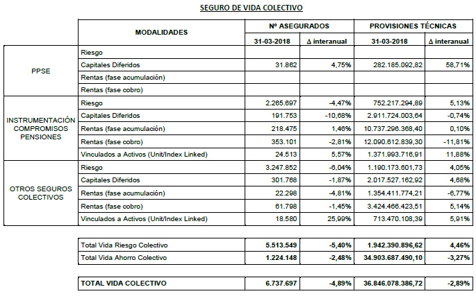 El seguro de Vida colectivo continúa perdiendo asegurados y ahorro gestionado. Según los datos de ICEA recopilados por Unespa, en el primer trimestre del año el número de asegurados ascendía a 6,7 millones, con un descenso del 4,89%; mientras que las provisiones matemáticas sumaban 36.846 millones, con una caída del 2,89%. En ambos casos, el retroceso es mayor que el que se registraba un año antes, sobre todo en el caso del número de asegurados.