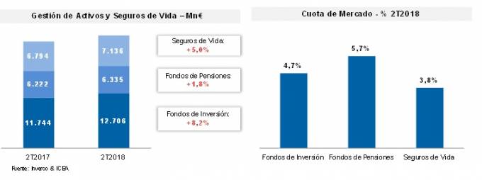 El saldo gestionado en Fondos de Pensiones asciende a 6.335 millones de euros, un 1,8% más que al cierre del primer semestre de 2017, lo que representa una cuota de mercado del 5,7%. Mientras, los seguros de Vida han aumentado un 5% interanual hasta los 7.136 millones de euros, un 3,8% del mercado español.