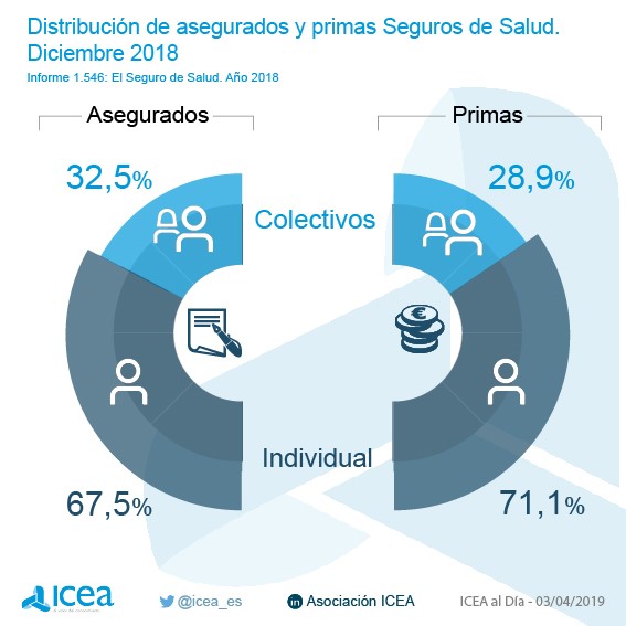 Los datos de ICEA confirman que los seguros colectivos de Salud registraron un buen año y crecieron en 2018 un 6,8% en primas y un 6,7% en asegurados. Aportaron el 28,9% de las primas del ramo. Mientras, los seguros individuales recaudaron el 71,1% de las primas y sumaron el 67,5% de los asegurados. El crecimiento de las primas en los seguros individuales fue del 5%.
