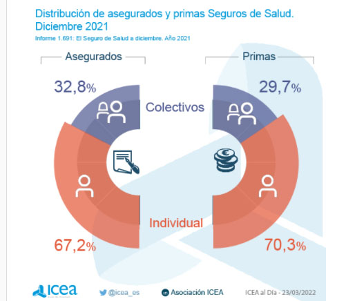 El informe de ICEA 'El Seguro de Salud. Estadística diciembre 2021' señala que los seguros individuales supusieron el 70,3% del volumen de primas y algo más del 67% del número total de asegurados. No obstante, y sobre el crecimiento, los seguros colectivos aumentaron un 5,18% en volumen de primas frente al 5,13% de los seguros individuales.