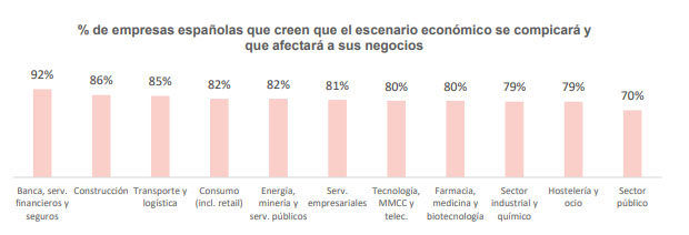 Otro dato significativo es el número de empresas que apuntan que todavía no han recuperado sus niveles prepandemia y acuciados por la inflación, la guerra en Ucrania o el fin de las moratorias y la carencia de los préstamos ICO. Nuevamente los servicios financieros, incluido el seguro, se encuentra entre los sectores que