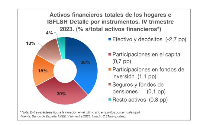 Al cierre de 2023, el grueso de los activos financieros de los hogares se mantuvo en efectivo y depósitos (el 38% del total), seguido de participaciones en el capital (30%), participaciones en fondos de inversión (15%) y seguros y Fondos de Pensiones (13%).