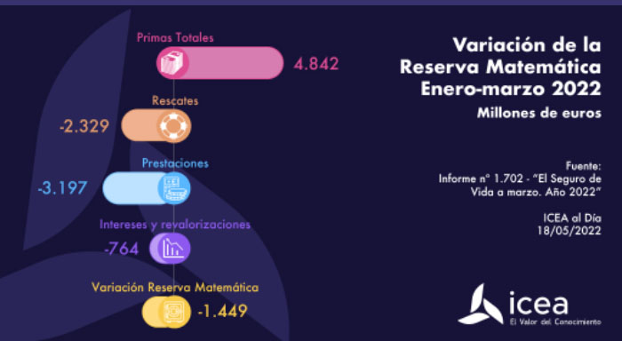 A finales del primer trimestre del año, las reservas matemáticas de los seguros de Vida alcanzaron los 194.644 millones de euros. Un dato que decrece en 1.449 millones respecto al año anterior. Según el análisis de ICEA esto se debe en su totalidad a los seguros con garantías de interés que bajaron en más de 2.000 millones, mientras que los seguros vinculados a activos aumentaron en 562 millones.