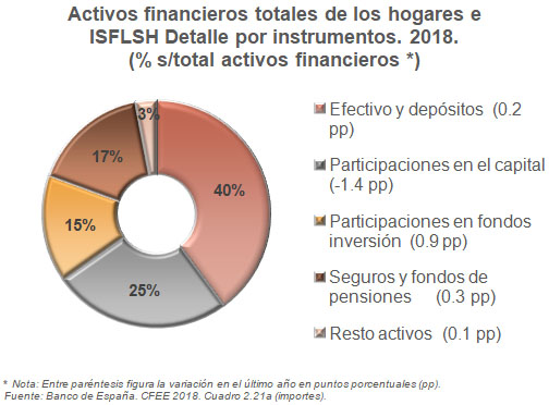 De esta cantidad, los seguros y Fondos de Pensiones representan el 17%, con un ligero crecimiento de 0,3 pp en el último año. El activo principal de la economía española se encuentra en efectivo y depósito con una representación del 40% sobre el total; le siguen las participaciones en el capital (25%) y las participaciones en fondos de inversión (15%). El crecimiento más significativo se dio en los fondos de inversiones que ganan un peso de 0,9 pp, mientras que la mayor caída respecto al año anterior se da en las participaciones en el capital con -1,4 pp.