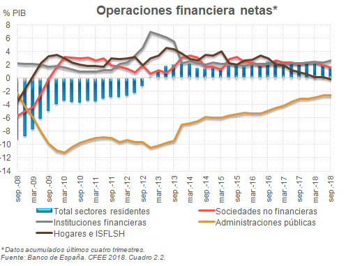El crecimiento en los activos financieros se debe, según el informe, a la adquisición neta de activos financieros por valor de 22.000 millones de euros durante los 4 últimos trimestres y también por unas valorizaciones netas negativas de 2.000 millones. esto se debe, fundamentalmente, a la caída de los activos de renta variable, explicar el organismo financiero.