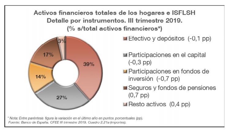 Seguros y Fondos de Pensiones son el activo financiero en el que más han invertido los hogares españoles en el 3º trimestre de 2019 según datos del Banco de España. El 17% del capital de los hogares está en estos activos mientras que el 39% se encuentra en efectivo y depósitos y el 27% en participaciones. Los Fondos de Inversión acaparan el 14% de los activos.