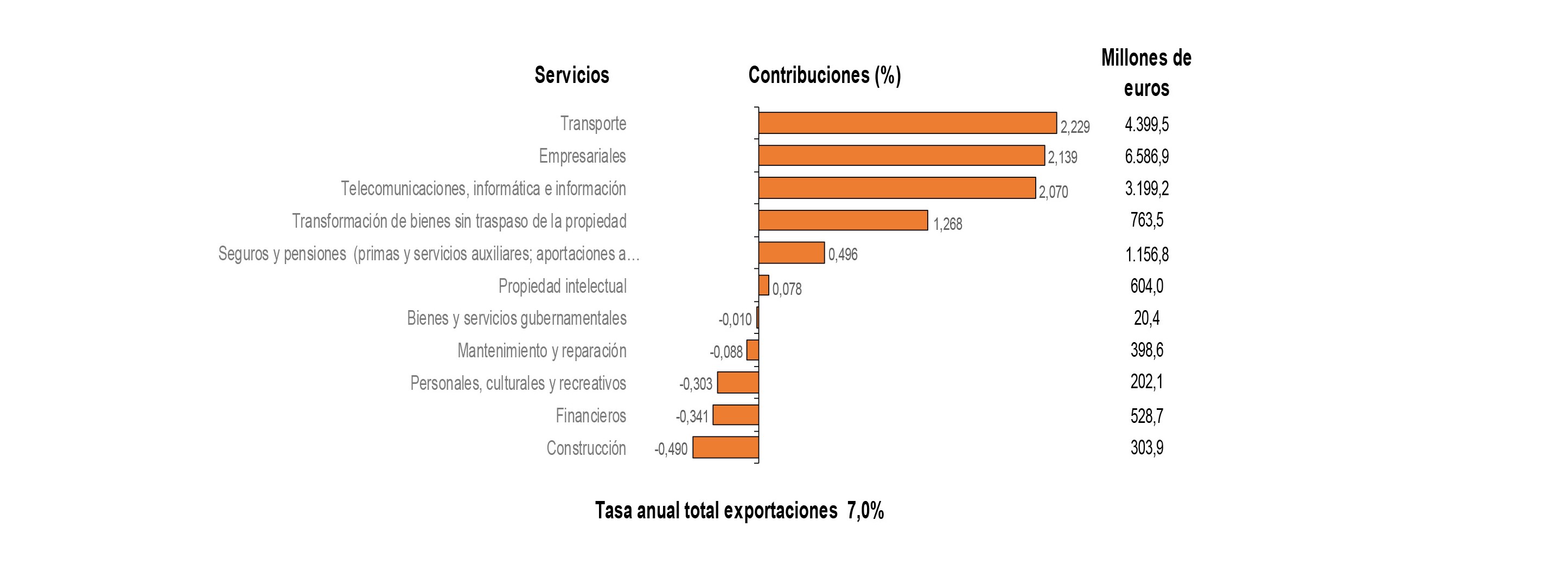 Por tipo de servicio, los que mayor contribución positiva aportaron en el 4º trimestre a la tasa anual fueron los Transportes, cuyas exportaciones alcanzaron los 4.399,4 millones de euros, y Empresariales, con 6.586,9 millones.