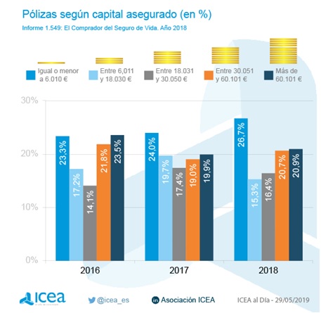 El comprador de seguros de Vida en 2018 es un varón (el 56,5% de los compradores), de entre 35 y 44 años (el 28,7% del total), casado (un 43,6%), y residente en capitales de provincia (un 23,9%), que contrata seguros de riesgo con un capital asegurado medio de 39.064 euros y con una duración de menos de cuatro años (el 70,5%).