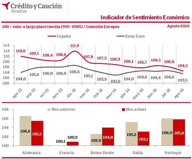 En agosto, el Indicador de Sentimiento Económico de la CE, en cuya elaboración Crédito y Caución es panelista, según informa la compañía, disminuyó en España (1,5 puntos) hasta su nivel más bajo desde 2014. El Indicador también cayó en el conjunto de la UE (0,9 puntos) y la zona euro (0,1 puntos). Entre las mayores economías de la zona euro, el indicador aumentó solamente en Francia (0,8 puntos).