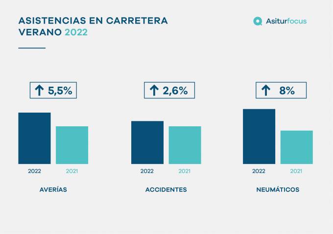 Respecto al verano de 2021, el Observatorio de Siniestros Asitur Focus ha constatado este año un incremento del 5,4% en las asistencias en carretera. Los servicios derivados de averías han aumentado un 5,5%, mientras que por accidentes lo han hecho en un 2,6%. En el caso de los problemas en los neumáticos, el crecimiento de asistencias ha sido del 8%.