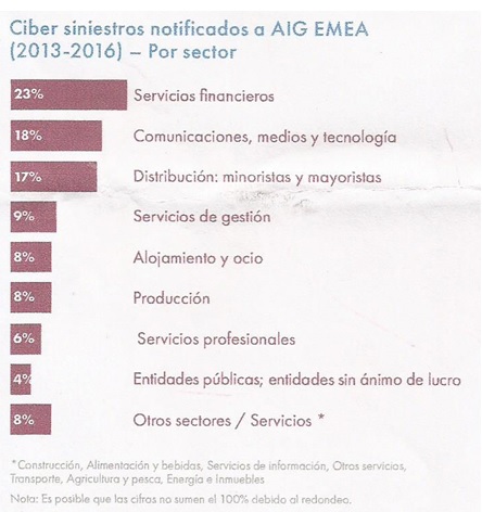 Por sectores, la mayor parte de los cibersiniestros registrados proceden de los que tienen la obligación de notificar a sus clientes cualquier incidente que afecte a información de carácter sensible como son los servicios financieros (con una cuarta parte de todas las ciber reclamaciones recibidas por AIG EMEA en los últimos tres años); y comunicaciones, medios y tecnología (con un 18%).
