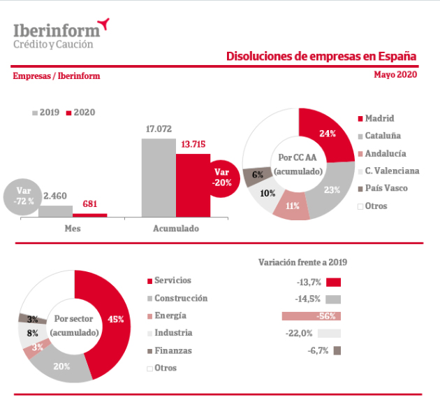 Iberinform, filial de Crédito y Caución, ha publicado su análisis anual acerca de la constitución y disolución de empresas durante el pasado mes de mayo. Según estos datos ambos aspectos continúan cayendo, en lo que significa que "la hibernación de la economía española continua". En mayo se registraron un total de 681 disoluciones de empresas y se constituyeron 3.087, lo que significa una caída del 72% y del 64%, respectivamente, en relación al mismo periodo del año anterior.