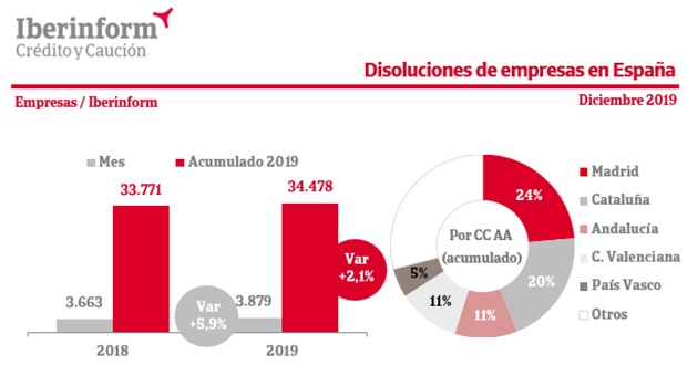 Sigue creciendo el número de empresas que desaparece en nuestro país. A cierre de 2019 se han producido 34.478, un 2,1% más que en 2018, según datos de Iberinform. Ha sido la Comunidad de Madrid donde más disoluciones se declaran (24% del total de casos). Le siguen Cataluña (20%), Andalucía (11%) y Comunidad Valenciana (11%). Por sectores, predominan las disoluciones de compañías dedicadas a Servicios (43% del total), seguidas por empresas de Construcción (19%) e Industria (8%).