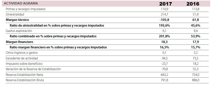 La actividad del CCS durante el año 2017 ha estado marcada principalmente por la alta siniestralidad en el seguro agrario combinado, la segunda más alta de la historia. La siniestralidad en la actividad agraria en su conjunto fue del 193,6% de las primas con un coste de 215 millones de euros, frente al 45,6% del año anterior. La siniestralidad del coaseguro representó el 88,3%, mientras que la del reaseguro alcanzó el 352% de las primas, según datos extraídos del Informe Anual 2017.