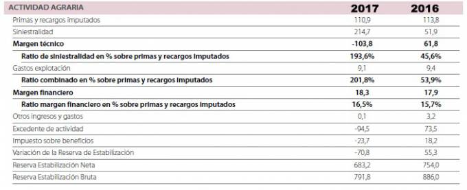 En cuanto a la situación patrimonial de la entidad, la reserva de estabilización disponible para la cobertura de los riesgos asegurados al cierre de 2017 alcanzó los 8.370 millones de euros en la actividad general y 791,8 millones de euros en la Actividad Agraria.
