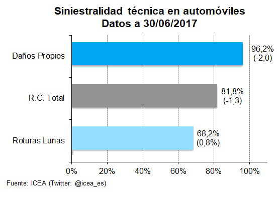 A 30 de junio de 2017, Daños Propios era la garantía que tenía una siniestralidad técnica más elevada en Autos, alcanzando el 96,2%, 2 puntos por debajo del valor del año anterior; seguida por RC, con 81,8%. Los valores más bajos se dieron en Incendios y Retirada del Carnet, situándose entre el 3% y el 18%, según los datos de ICEA.