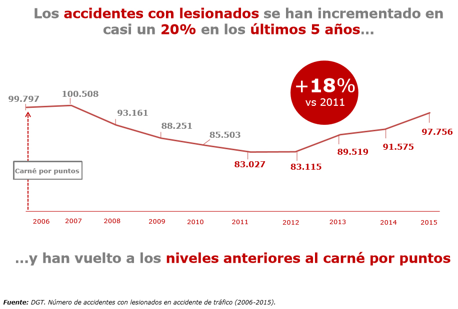 Francisco Valencia ha manifestado que las cifras de accidentes con lesionados igualan a las previas de la entrada en vigor del carné por puntos. En 2015 alcanzó los 97.756 frente a los 99.797 de 2006. El punto más bajo fue en 2011 cuando se registraron 83.027. De hecho, en los últimos 5 años los accidentes con lesionados se han incrementado en un 18%, mientras que el número de personas heridas de distinta gravedad lo ha hecho un 16%. En total, desde 2006 se han registrado 1,3 millones de personas heridas en accidentes de tráfico.