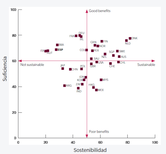 El sistema de pensiones español ocupa una buena posición en suficiencia, buen gobierno y comunicación, pero su indicador de sostenibilidad es mejorable. Implica que el sistema ocupe el puesto 23º entre los 34 países analizados en la edición del Melbourne Mercer Global Pension Index. El trabajo pone de relieve qué países están mejor preparados y cuáles están en peor posición para superar los desafíos de los sistemas, sobre todo en lo que concierne al envejecimiento de la población.