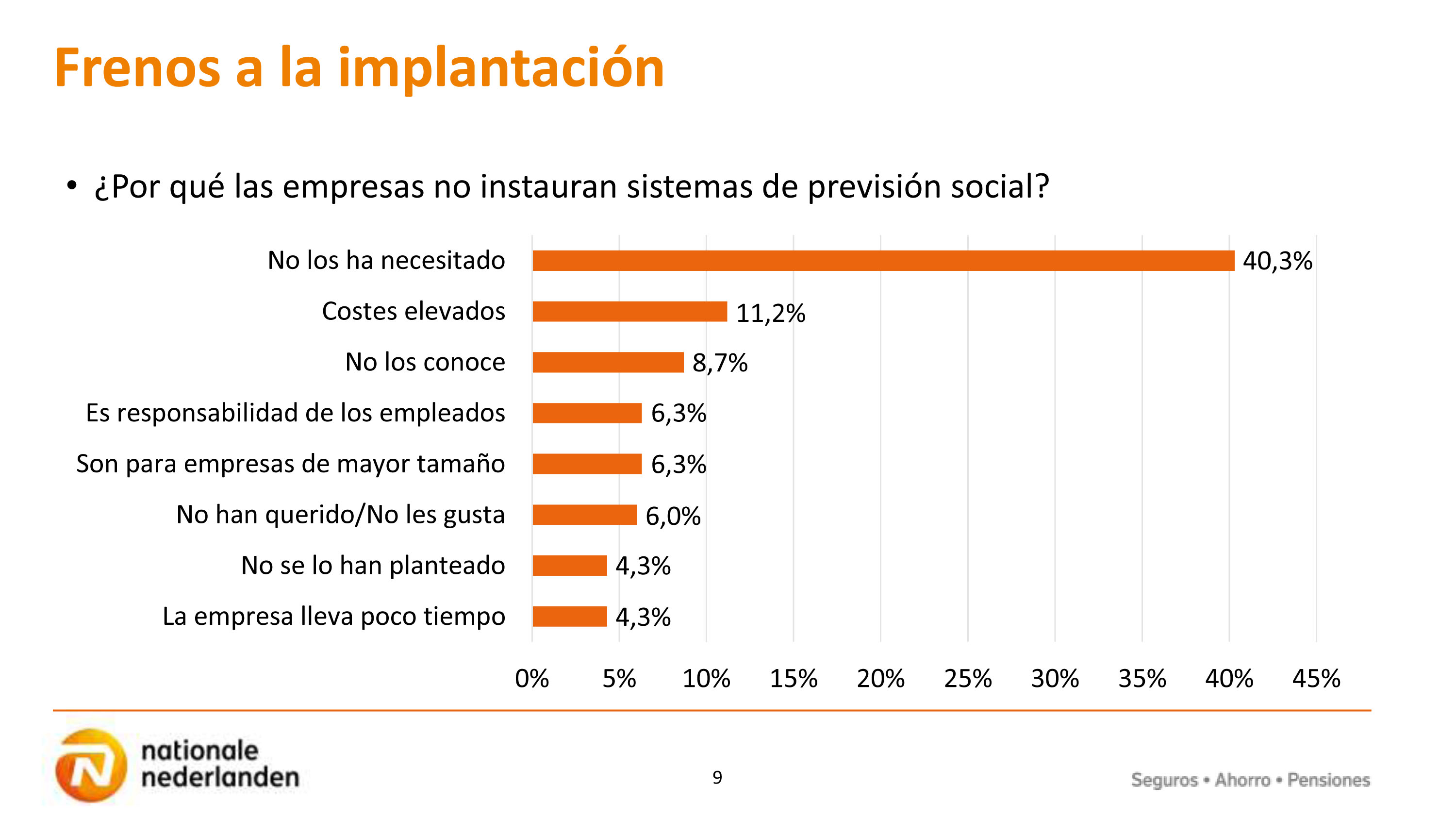 Juan Marina, director de Nationale Nederlanden Employee Benefits, explicó durante la presentación del estudio que la falta de información es una de las principales causas por las que las compañías no disponen de un sistema de previsión social para la jubilación. De hecho, tan solo el 8,1% de las empresas españolas ofrece a sus trabajadores soluciones de previsión que complementen los ingresos de sus empleados en el momento de la jubilación. "Queda mucho por hacer, señaló Marina, para desarrollar el segundo pilar". Y el problema aumenta en el caso de las pymes donde el 92% no cuenta con ningún tipo de sistema de previsión.