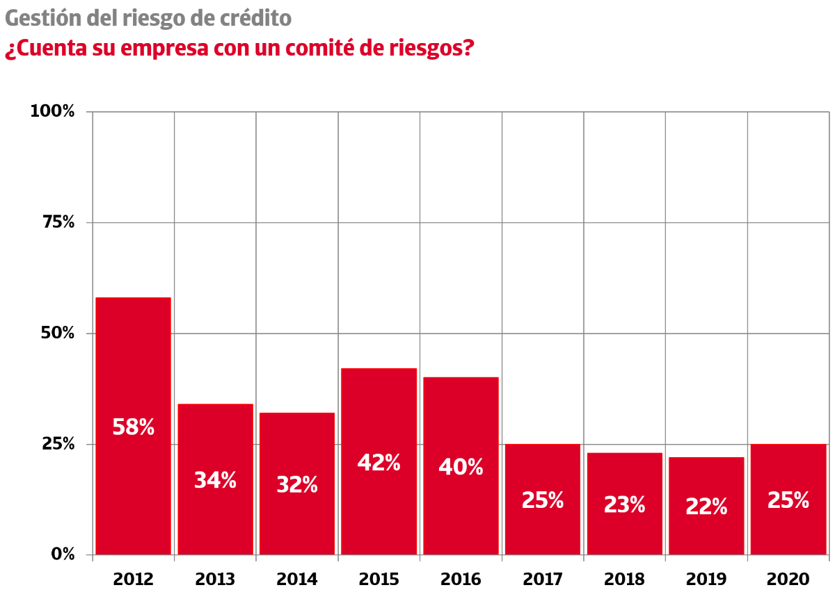 Las empresas vuelven a crear estructuras especializadas para controlar el riesgo de impago. Así se refleja en el último 'Estudio de Riesgo de Crédito' impulsado por Crédito y Caución e Iberinform. El 25% de las empresas entrevistadas afirman que actualmente cuentan con un comité de riesgos, rompiendo así la tendencia bajista de los años anteriores. No obstante, este porcentaje aún está muy lejos del registrado en 2012, cuando un 58% de las empresas disponía en su seno de un órgano encargado del control sistemático y transversal de la cartera de clientes para analizar su exposición al riesgo. En este estudio han participado más de 700 gestores de empresas.