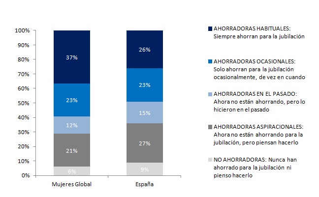 Así, siguiendo esta clasificación, el 26% de las españolas son ahorradoras habituales, el 23% es ahorradora ocasional, un 15% afirma que no ahorra en la actualidad, pero sí lo ha hecho en el pasado mientras que un 27% son ahorradoras aspiracionales; esto es, no ahorra para su jubilación pero saben que tienen que hacerlo y esa es su intención. Por último, el 9% de las encuestadas confiesa que no ha ahorrado nunca para su jubilación ni tiene la intención de hacerlo.