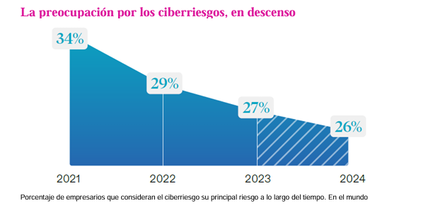 A pesar de la importancia que la industria española da a los ciberataques, el informe también muestra que la preocupación por los mismos a nivel global decae. En 2024 la preocupación era así para el 24%de los empresarios, mientras que en 2021 lo era para el 34% de estos directivos.