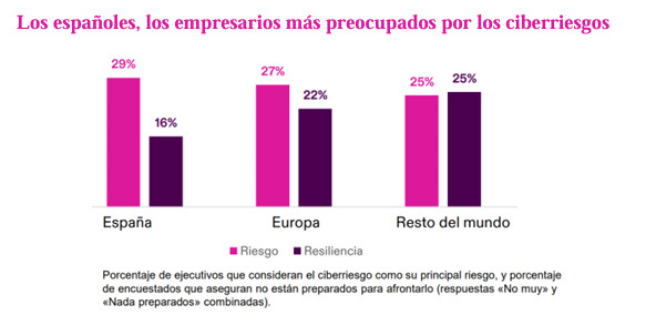 El texto apunta que casi 3 de cada 10 de los empresarios con sede en España cita este riesgo como la amenaza número 1 a la que se enfrentan este año. Un porcentaje superior a lo que muestran directivos de Estados Unidos, Canadá, Reino Unido, Francia, Alemania y Singapur.