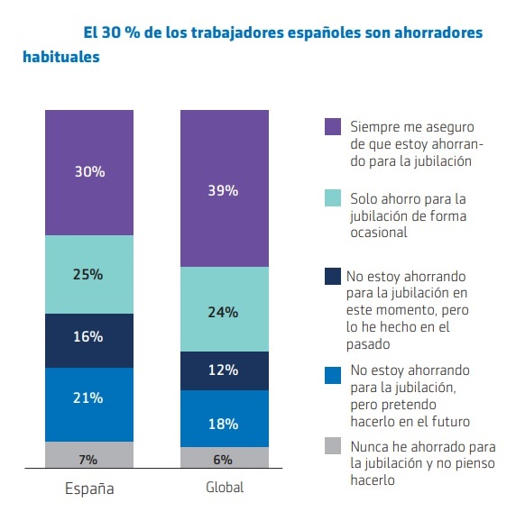 El 25% de los encuestados afirma ahorrar de forma ocasional y el 16% asegura no estar ahorrando actualmente, aunque lo ha hecho en el pasado. De hecho, tan solo el 17% de los trabajadores afirma ser un "estratega de la jubilación", es decir, contar con un plan de jubilación por escrito. Si bien un 32% asegura contar con un plan de jubilación no escrito, cerca del 50% no tienen ningún plan en mente.